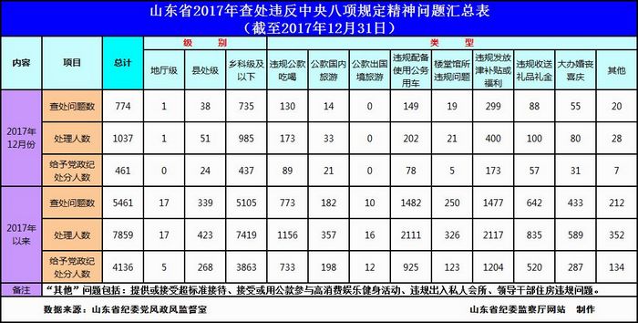 2017年12月,山东省各级纪检监察机关查处违反中央八项规定精神问题774起,处理1037人,给予党政纪处分461人。