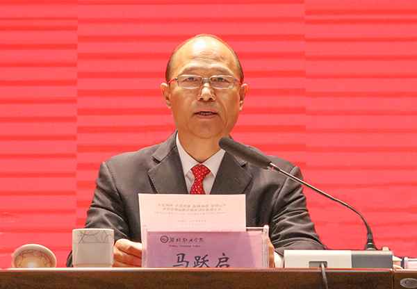 马跃启代表学院党委对大会的召开表示热烈祝贺。他充分肯定了学院2018年的工作成绩,指出了学院存在的问题,分析了当前经济社会和职业教育形势,从以党建工作为统领,全面推进从严治党向纵深发展;以优质和高水平高职院校建设为抓手,全面推进高质量发展;以争创省级文明校园为目标,全面推进内涵发展;以深化改革为动力,全面推进创新发展;以开展“工作落实年”为契机,全面推进工作落实等方面,对2019年工作任务进行了重点强调,并要求代表们以高度的政治担当和使命自觉,认真履行代表职责,正确行使民主权利,积极建言献策,为学院发展贡献力量。