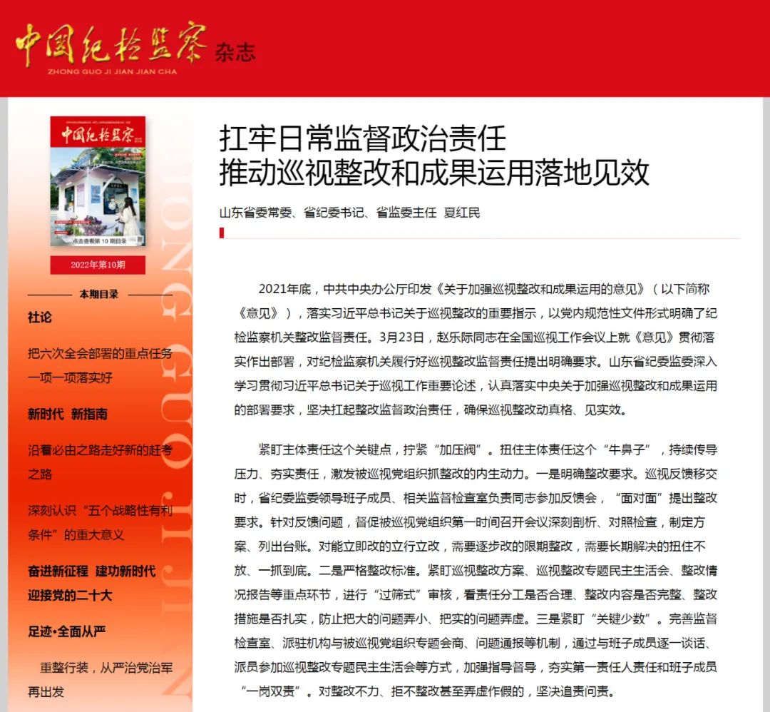 2022年第10期《中国纪检监察》杂志刊发山东省委常委、省纪委书记、省监委主任夏红民署名文章《扛牢日常监督政治责任 推动巡视整改和成果运用落地见效》。